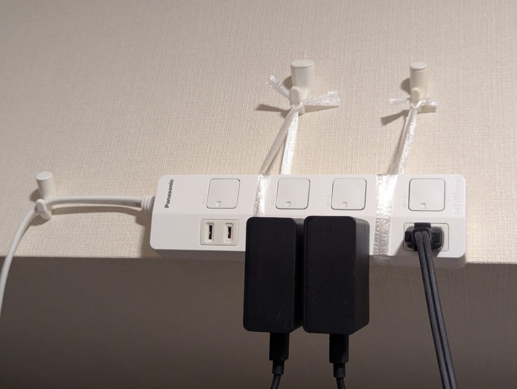 壁に粘着テープで貼り付けていた電源ハブがはがれてどうしようか思案したまま放置していたのだが、釘固定のフックから紐で垂らせばかなり安定することを発見した。